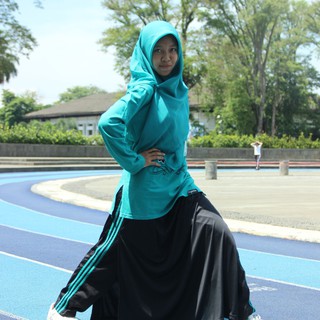 Baju olahraga muslimah ayesha terdiri dari atasan kaos, celana training dan rok celana muslimah.